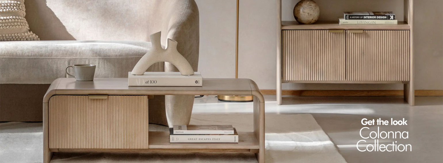 Introducing the Gallery Direct Colonna Collection – a stunning range that combines contemporary elegance with timeless craftsmanship. Featuring beautifully curved tops, signature fluted doors, and exquisite Mango Wood construction finished with Brass Gold colour detailing, this collection brings warmth and sophistication to any home.