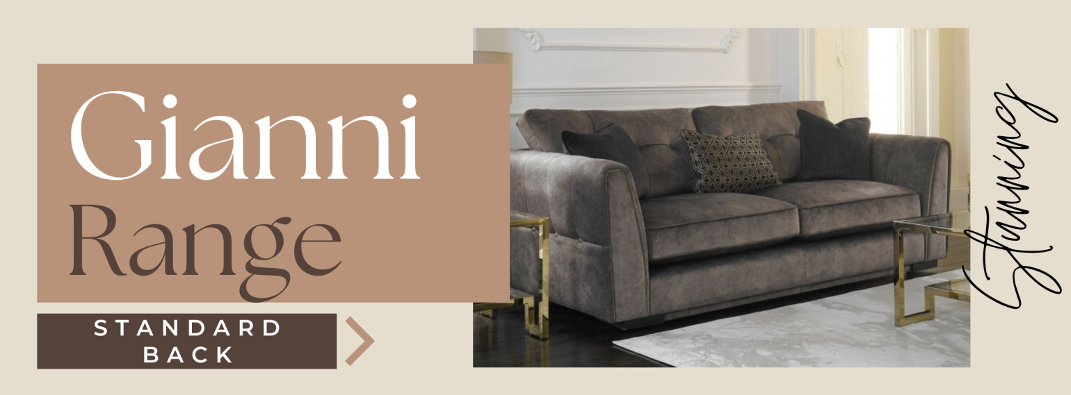 Another fabric option is the gorgeous Gianni Range. With all the sizes for any space, this range is a perfect addition to any living room. It offers contemporary styling with a stunning luxurious look. This stylish, eye-catching, high back sofa is sumptuous, combining marble velvets with contrast metallic cushions and features a floating plinth design.