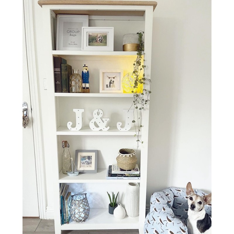 The Chester Oak painted range - colour based on Farrow and Ball All White - large tall bookcase is a key piece in the Chester living range. The bookcase is complete with 5 well sized shelves, all of which are fixed. The bottom two shelves are 34cm in height, the top 3 shelves are 25cm high. This tall oak bookcase is made to a high standard using a combination of oak and oak veneers.